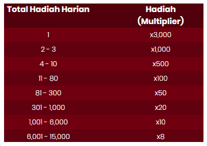7. Pemain akan memenangkan hadiah berupa multiplier dari jumlah taruhan seperti yang tertera di Tabel hadiah.