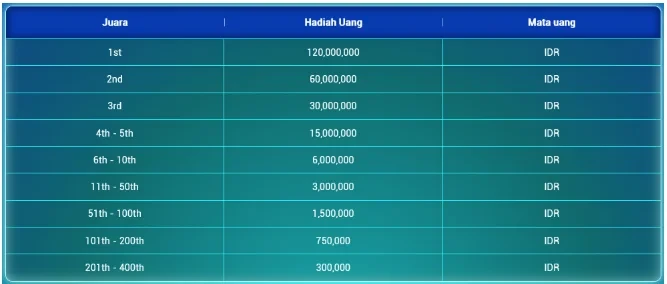 7. Hadiah Turnamen dengan total hadiah senilai IDR 600.000.000 yang akan dibagikan selama periode promosi.