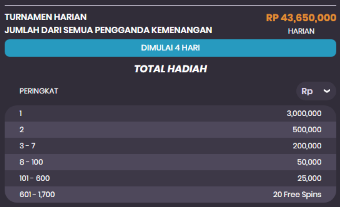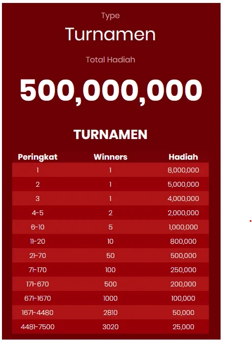 2. Total Hadiah IDR 1.500.000.000 akan dibagikan kepada 6,000 Pemain dengan skor tertinggi di papan peringkat.